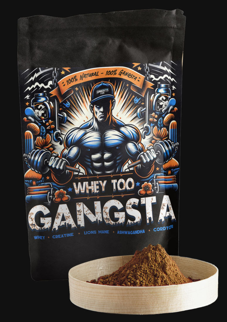 This blend is loaded with fitness-enhancing additives such as creatine for strength, lion's mane for cognitive sharpness, cordyceps for stamina, and ashwagandha for stress support. "Whey Too Gangsta" isn't just protein; it's your new training partner, optimizing recovery and powering your journey to peak performance with every rep and set.